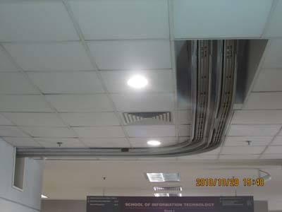 办公文件传输、分拣系统。培训参观期间,我们很惊奇地发现在NYP的各个楼内走廊的天花板上,都有一个滑道,不时有一个类似微波炉大小的箱子在滑道上通过,像一辆小火车。经过请教带队参观的潘老师,我们才知道,在新加坡的很多单位,尤其是医院和学校里,都有这种办公文件传输、分拣系统,它连接着一个单位的各个办公室,各办公室凭密码从里面领取文件,既提高了工作效率,又节省了人力。
