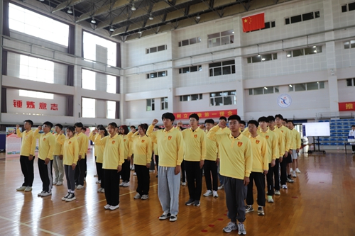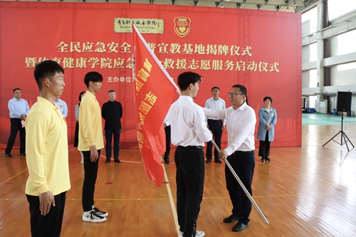 启动仪式上,王金生和刘志义共同为“全民应急安全科普宣教基地”揭牌。邢广陆代表我校致欢迎辞,马强向我校体育健康学院应急安全救援志愿队授旗。应急安全救援志愿队代表、体育健康学院学生张永豪带领志愿队宣誓。