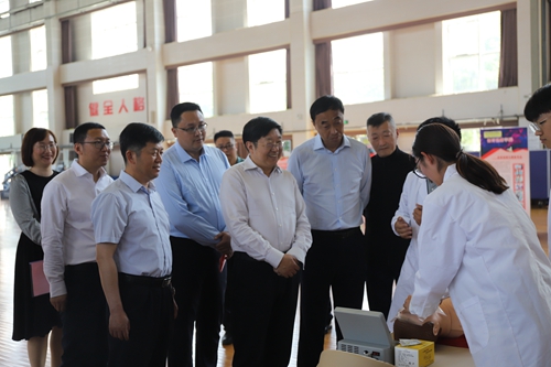 仪式开始前,王金生陪同客人参观了体育健康学院举办的应急安全救援知识科普展览。在实操模块展示环节,来自体育保健与康复专业的社团学生分别进行了简易担架、事故现场救援、心肺复苏、绷带包扎、常见损伤与康复等现场救援展示。