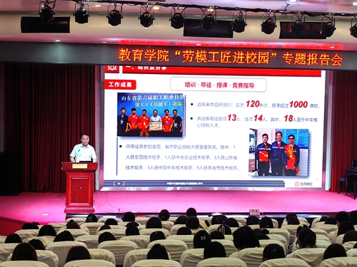 为深入学习贯彻习近平新时代中国特色社会主义思想,全面贯彻落实党的二十大精神,大力弘扬劳模精神、劳动精神、工匠精神,6月8日,教育学院邀请中共二十大代表、全国劳动模范、中车青岛四方机车车辆股份有限公司钳工首席技师、中国中车首席技能专家、山东省总工会兼职副主席、我校校友郭锐来校作“劳模工匠进校园”专题报告,报告会由教育学院党总支副书记贾勇主持,学校400余名师生代表、青马工程培训班学员现场聆听了专题报告。