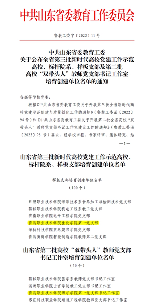 近日,省委教育工委公布了全省第三批新时代高校党建工作示范高校、标杆院系、样板支部及第二批高校“双带头人”教师党支部书记工作室培育创建单位名单,我校生物与化工学院第一党支部入选全省高校党建工作样板支部培育创建单位,海尔学院第一党支部书记工作室入选全省高校“双带头人”教师党支部书记工作室培育创建单位。