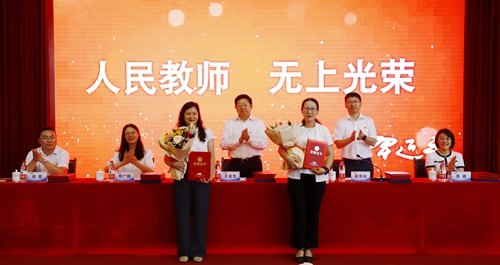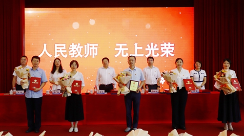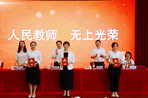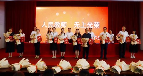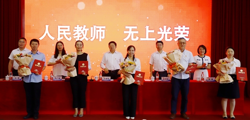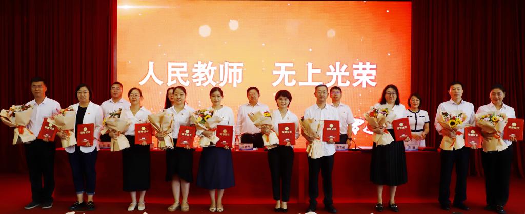 庆祝大会在国歌声中拉开帷幕,参会教师集体进行了争做“四有”好教师为党育人为国育才的庄严宣誓。大会表彰了2022-2023学年度获得省、市、校各级各类突出成就的优秀教师。会议现场部分新老教师代表举行了隆重的结对拜师仪式。