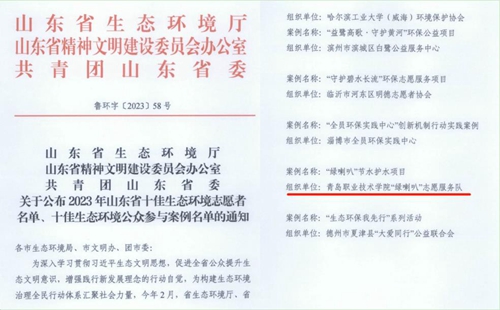 近日,山东省生态环境厅、山东省精神文明建设委员会办公室、共青团山东省委发布《关于公布2023年山东省十佳生态环境志愿者名单、十佳生态环境公众参与案例名单的通知》,我校生物与化工学院提报的绿喇叭“节水护水”项目荣获“2023年山东省十佳生态环境公共参与案例”。