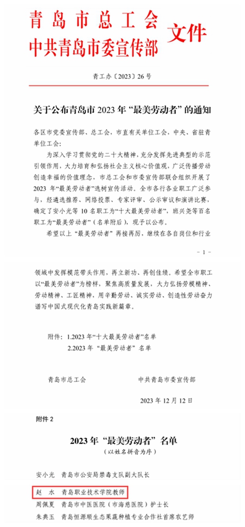 近日,在青岛市总工会和市委宣传部联合组织开展的2023年“最美劳动者”选树宣传活动中,经过遴选推荐、网络投票、专家评审、公示审议等环节,我校海尔学院教师赵水荣获青岛市2023年“最美劳动者”称号。