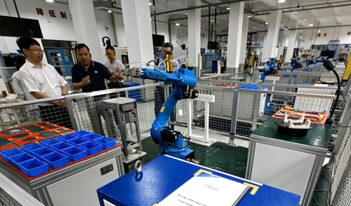 5月21日,考察团首站来到华中科技大学科技园,先后与华中科技大学出版社就战略合作特别是共建新形态一体化教材事宜进行了深入洽谈;与华中数控股份有限公司就深化产教融合、校企合作事宜进行了深入交流,并实地参观了公司展厅,深刻领略了华中数控人发展民族品牌的大国工匠精神。在华中科技大学校园内,实地参观了该校工程实践中心智能制造生产线、加工中心、虚拟仿真实训区、工业机器人实践区等教学模块,就创新实验室建设、综合训练课程开发、人才培养成效等方面进行了积极探讨。
