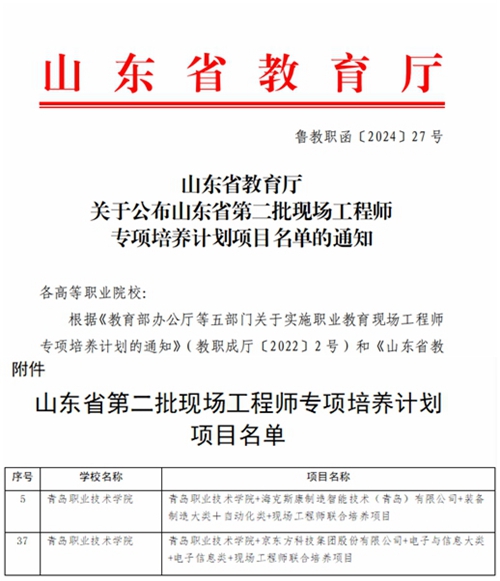 近日,山东省教育厅公布了第二批现场工程师专项培养计划项目遴选结果,我校申报的“海克斯康制造智能技术(青岛)有限公司+装备制造大类+自动化类+现场工程师联合培养项目”“京东方科技集团股份有限公司+电子与信息大类+电子信息类+现场工程师联合培养项目”2个项目全部获批立项。2023年,我校申报的“海尔集团公司+装备制造大类+自动化类+现场工程师联合培养项目”“万华化学集团股份有限公司+生物与化工大类+化工技术类+现场工程师联合培养项目”获批第一批现场工程师专项培养计划项目立项。目前学校共获批立项的现场工程师项目达到4个。