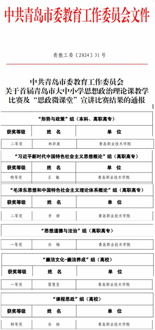 近日,青岛市委教育工委发布了《中共青岛市委教育工作委员会关于首届青岛市大中小学思想政治理论课教学比赛及“思政微课堂”宣讲比赛结果的通报》,我校参赛教师荣获特等奖2项、一等奖2项、二等奖2项,我校荣获优秀组织奖。