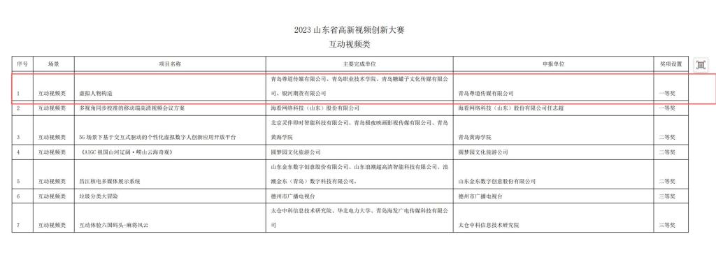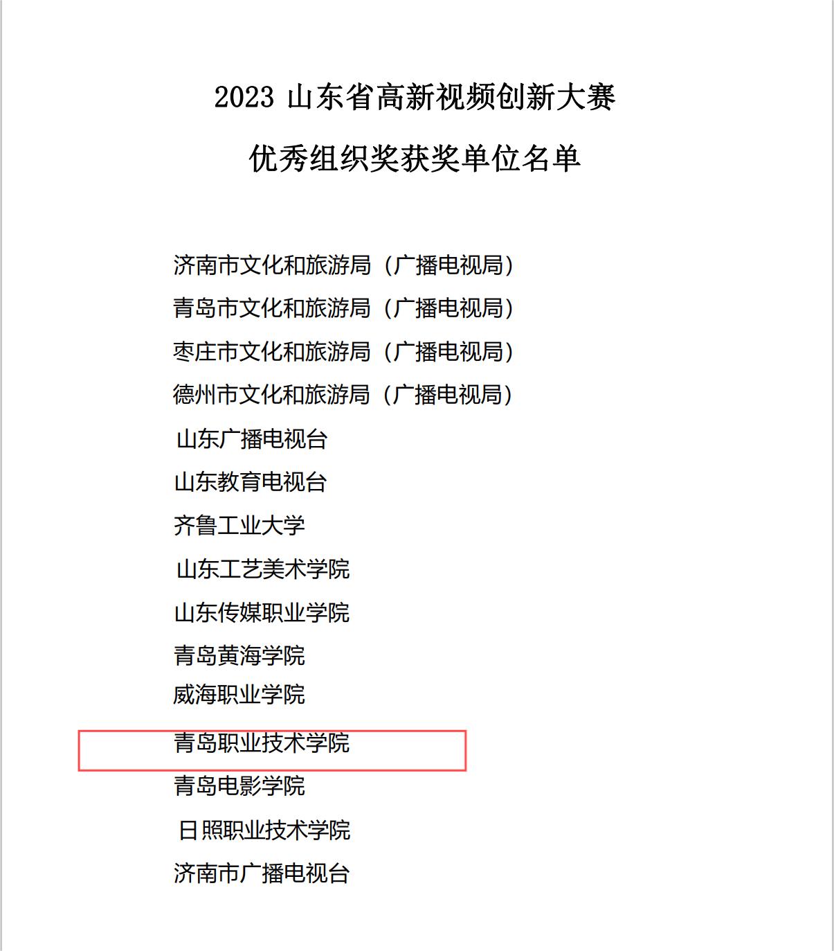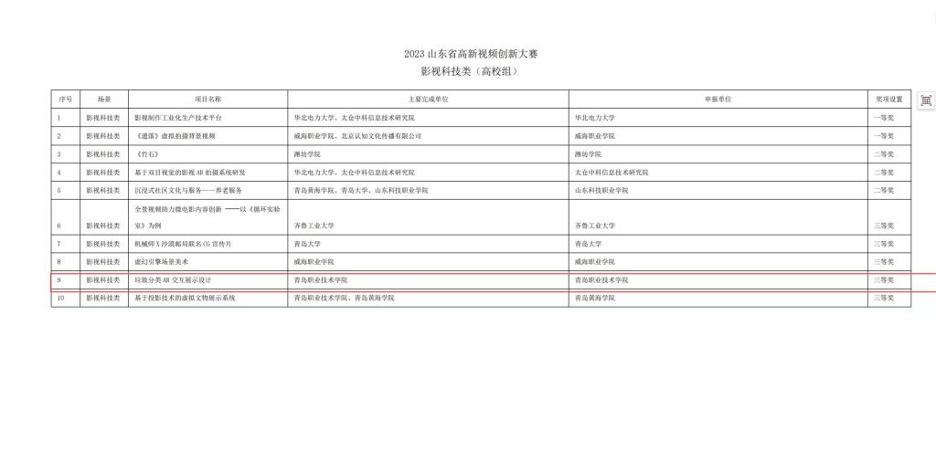 近日,由山东省广播电视局、山东省教育厅、山东省科学技术厅、山东省工业和信息化厅联合举办的山东省高新视频创新大赛2023成果发布暨2024启动仪式在济南举行,我校艺术学院影视多媒体技术专业成绩斐然,获得一等奖1项、二等奖1项、三等奖2项,学校获优秀组织奖。