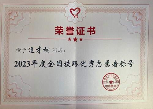 逄才桐在志愿服务中任劳任怨、乐于奉献,出色的表现得到了车站工作人员和广大旅客的一致好评,成为了一道亮丽的风景线。此次荣获“2023年度全国铁路优秀志愿者”称号,是国铁集团对我校志愿服务工作的认可和鼓励。下一步,我校将继续积极引导志愿者参与校内外志愿服务,展现青春作为、彰显青春风采、贡献青春力量,争做有理想、敢担当、能吃苦、肯奋斗的新时代好青年,奋力书写为中国式现代化挺膺担当的青春篇章。