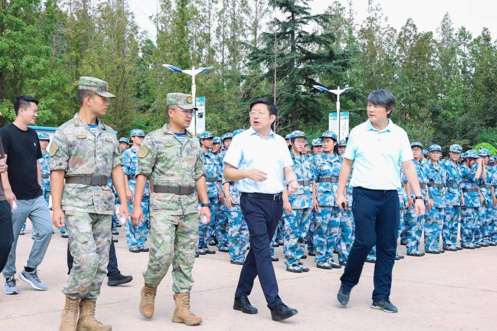 上午,王金生一行深入新生军训团各营地,看望慰问承训部队官兵、2024级新生、值班教师和医疗保障人员,向大家致以节日的问候。王金生对承训部队官兵们科学施训、认真组训、严格管训,确保军训工作顺利、有序进行的辛勤付出给予高度评价,对参训新生在军训过程中呈现出的坚忍不拔的意志和勇于拼搏的精神表示高度赞扬。在军训现场,王金生还与新生亲切交谈,仔细询问训练情况和入学以来的生活适应情况,勉励同学们珍惜军训时光,持续淬炼坚韧意志、锻造高尚品格。同时,王金生要求学生工作部要紧密协调相关部门共同持续做好军训教官的服务保障工作,为军训教官顺利开展工作提供良好条件和有力支持。