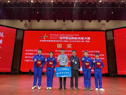 10月28日至30日,2024年世界职业技能大赛总决赛争夺赛高职组生物与化工赛道二(化工生产技术小组)赛项比赛在兰州石化职业技术大学举行。经过激烈角逐,由我校生物与化工学院院长王东领队,教师左常江、董相军指导的于中洋、于杨城、胡玉梅、尹忠豪四名学生组成的代表队,以总得分620分和总排名第八名的优异成绩摘得银奖。