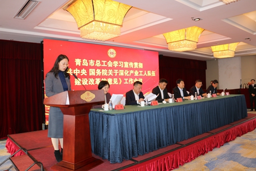 10月31日,青岛市总工会组织召开了学习宣传贯彻《中共中央国务院关于深化产业工人队伍建设改革的意见》工作会议,青岛市人大常委会副主任、市总工会主席张建刚出席会议并讲话;市总工会党组书记、常务副主席潘思晓主持会议;市总工会领导班子成员,各区市总工会主席和常务副主席、有关市直企业工会主席、市总工会机关各部门负责同志参加会议。我校工会主席、党委副书记邢广陆在会上作了题为《建设一流工匠学院,助力打造“工匠之城”》的交流发言。