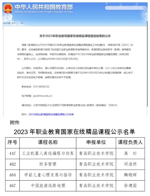 近日,教育部公示了2023年职业教育国家在线精品课程遴选结果。我校《工业机器人离线编程与仿真》《财务管理》《中国旅游线路地理》《学前儿童心理发展与指导》4门课程入选。截至目前我校共获评11门国家在线精品课程。