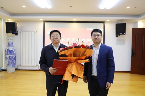 秦青松代表学校党委向王金生赠送荣休纪念品及鲜花