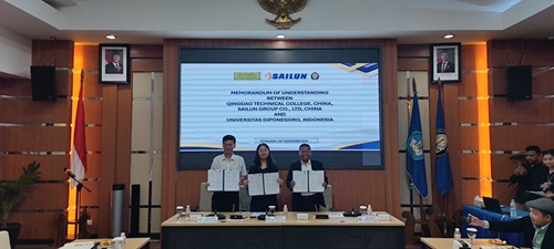 签署仪式前,团组与学校创新与协作部、教务处、工程学院、信息学院、电子与电气学院、机电学院、化学学院、物流学院、应用技术学院等部门相关负责人进行会谈,就合作领域与专业、教师研修基地、学生互派交流等进行了深入对接。针对赛轮印尼工厂在人工智能与信息化、电气自动化、化学污水处理及物流等领域的联合研发进行了交流。邢广陆介绍了学校与赛轮集团合作的历程和合作模式,她表示,印尼迪波内戈罗大学作为印尼全国排名前列,拥有6万余名师生的综合院校,在印尼国内外均具有一定的影响力,希望两校以此次合作为契机,共同助力印尼“班•墨学院”建设,联合打造具有国际影响力的专业标准、课程标准、教学资源,在学分互认、学生互派、教师交流研修等方面开展合作。