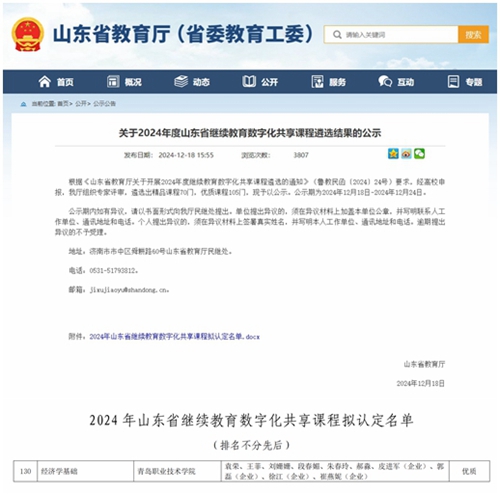 近日,山东省教育厅公布了2024年度山东省继续教育数字化共享课程遴选结果,我校《经济学基础》课程成功入选。