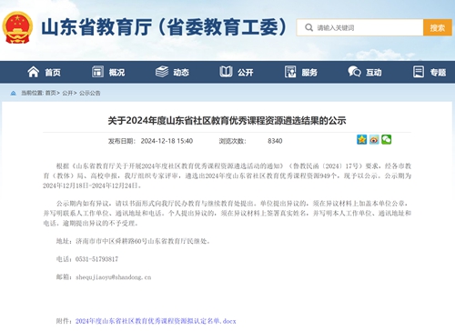 近日,山东省教育厅公布了2024年社区教育优秀课程资源遴选结果,我校有11门课程入选。此次遴选出的课程资源,将通过“山东终身学习在线”“山东老年学习在线”等平台,面向社会学习者开放共享。