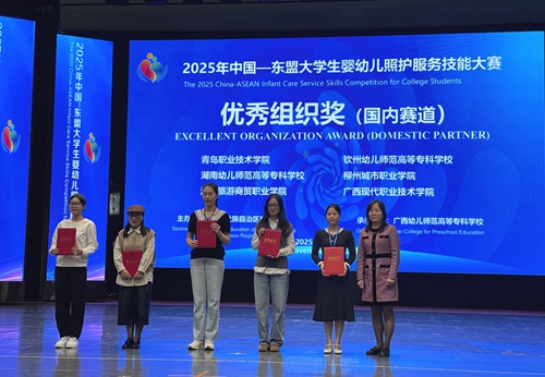 11月12日至14日,2025年中国-东盟大学生婴幼儿照护服务技能大赛在广西南宁顺利举办,共有来自中国、泰国、越南、马来西亚、印尼等国的100多名选手参加此次大赛,竞赛分国内、国际两个赛道。我校教育学院婴幼儿托育服务与管理专业学子再创佳绩,刘昕、叶秋杨两名同学凭借扎实过硬的专业功底在国内32支参赛队伍的激烈角逐中脱颖而出,斩获一等奖,我校荣获“优秀组织奖”,翟艺、马雪两名教师获“优秀指导教师奖”。