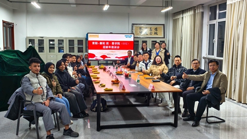 讲座结束后,与会人员与10名印尼国际学生在厚德楼405室开展座谈交流。国际学生分别进行了自我介绍,分享了四个月以来的学习收获和成长感悟。王电营在交流中勉励国际学生珍惜在校学习机会,充分依托学校语言学习平台提升语言应用能力,未来成长为赛轮集团印尼工厂的骨干力量。邢广陆高度肯定了国际学生在语言能力上的显著进步,并寄语学生们以王电营为榜样,把握宝贵的留学时光,在沉浸式语言环境中持续精进,为今后的职业发展奠定坚实基础。
