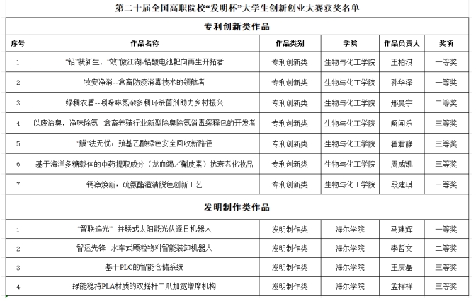 近日,第二十届全国高职院校“发明杯”大学生创新创业大赛圆满结束。我校以生物与化工学院、海尔学院为主组成的参赛团队,经学校初赛、网评复赛、全国总决赛等多个比赛环节脱颖而出,最终斩获一等奖3项、二等奖2项、三等奖6项的优异成绩。