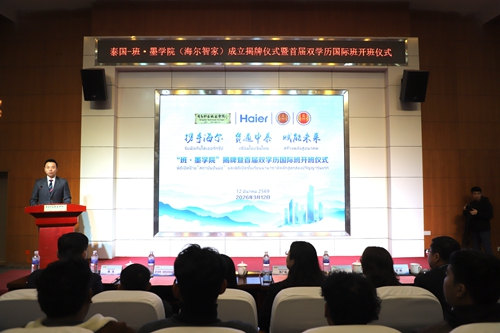 仪式上,邢广陆、陈浩、西拉麦特·帕查拉阿里亚通共同为泰国-班·墨学院(海尔智家)揭牌,标志着学院正式成立。青岛市国际合作交流中心副主任房鹏与我校海尔学院院长孙会扬共同为首届双学历国际班泰国学生发放入学礼包。