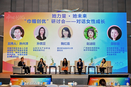在“工匠培养”与“女性成长”两场专题对话中,来自广东财贸职业学院、北京科技职业大学、山东商务职业学院、青岛职业技术学院、山东文化产业职业学院、柳州职业技术大学、广西国际商务职业技术学院、首都经济贸易大学等院校女领导,分别就工匠人才培育及职教女性成长路径等话题展开深入交流。其中,我校党委委员、副校长乔璐以“文化育匠·兴产强城”为主题,分享了学校将区域产业基因融入工匠文化育人方面的创新实践。