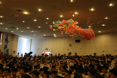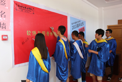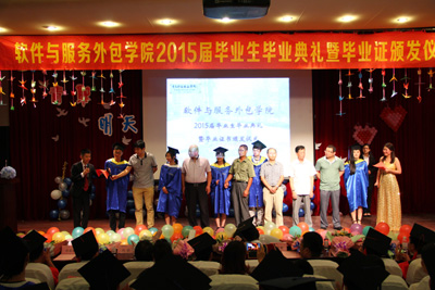 7月8日上午,软件与服务外包学院2015届毕业生携手踏上红地毯,在签名墙和祝福墙上留下恋恋心语,至此,软外学院以“青职,明天我会是你的骄傲”为主题的毕业生毕业典礼暨毕业证书颁发仪式拉开序幕。院长覃川、党委副书记刘甲珉出席典礼,宣传部、工会、学生处、团委、培训学院等部门负责人,海信通信有限公司人力资源部部长康存勇和易科德软件有限公司人力资源总监于福波参加了典礼。软外学院所有2015届毕业生与学院领导、老师、家长代表、企业嘉宾共同见证了这一激动人心的时刻。 伴着振奋人心的舞蹈和精彩的歌曲串烧,毕业典礼在热烈的气氛中拉开帷幕。在充满爱意的电子相册播放后,刘甲珉、软外学院党总支书记孙显录、企业代表康存永、于福波为“省级、院级优秀毕业生”、 2015届毕业生校友工作联络员颁发了证书。 抱着一颗感恩的心,学生代表孙鑫发言,把自己最真挚的祝福留给母校、留给老师、留给同窗。毕业生向教师和企业代表献花,全体毕业生鞠躬感谢师恩。抱着一颗感恩的心,毕业生接受了家长的祝福,相拥在一起,表达了平日里羞于开口的感激之情。在校生代表向毕业生代表献上了软外学院教师的亲笔书法“为自己点赞,让梦想飞翔”,祝福毕业生拥有美好而远大的前程;毕业生代表同时向软外学院赠送了礼物,寓意2015届毕业生在母校的祝福中已经做好准备,扬帆起航。 此次毕业典礼的亮点是软外学院充分利用了新媒体平台,为学生送上不一般的祝福:开通了“微信墙”,实现了现场的实时互动,“墙”上充盈着学弟学妹对学长学姐真挚的祝福;软外学院负责人为559名毕业生专门设置了559元的红包,在热闹的气氛中,带着祝福的红包飞到了毕业生手里;主持人还使用“摇一摇”,抽取了同时摇手机的30名毕业生,送上了学院的礼物。 覃川院长为毕业生上最后一堂课《家和万事兴》,对学子们寄予深深的期望。他教导毕业生“有了小家不忘大家,有了好日子不忘本”,功成名就,“土豪”一个,还望坚持底线,拒绝任性!路遇不顺,屌丝一枚,还望坚持梦想,拒绝惰性!”引起了全体毕业生的共鸣;更有一句“We are 伐木累”,引来了会场上阵阵热烈的掌声和喝彩声。在覃川院长的娓娓道来中,同学们更加理解了“家和万事兴”的深刻含义。在随后的毕业证书发放仪式上,覃川院长亲自向559名毕业生颁发了毕业证书,并亲切地与每一名毕业生合影留念,为毕业生的扬帆青春、再次远航送去了深深的祝福。