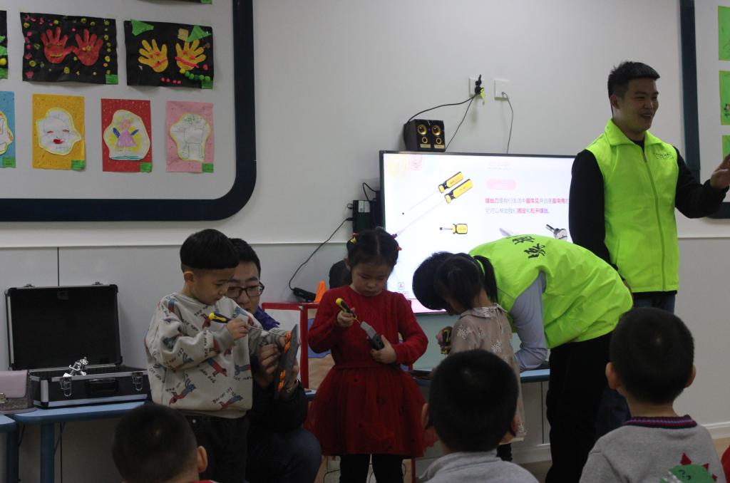 振超先锋科教团“创学体验”小组立足于数控、模具专业知识,联系幼儿的实际生活,将生活中常用的工具带进了课堂。“小锤子,敲敲敲;小钳子,夹夹夹;小剪刀,剪剪剪;订书机,咔咔咔;小小工具用处大,本领强大人人夸”。振超班成员用一首儿歌带领孩子们认识了工具箱里的常见工具。志愿者们通过演示大小不一的锤子、长短不一的铆钉和螺丝、螺口各异的螺丝刀的使用场景,带领孩子们探讨了工具的原理与功能,将抽象的概念具体化,孩子们听得饶有兴致,并与志愿者们积极地提问互动。活动中,志愿者还根据孩子们的年龄特点,专门设计了几款操作模具,带领孩子们利用螺丝刀等工具,锻炼动手操作能力,在学习与创造的同时体验快乐,也让工匠精神根植于每个孩子的心间。