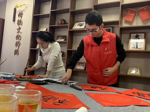 活动现场,瀚海书院的同学们与峨眉山路社区书法爱好者一道,在社区传统文化驿站摆书案、摊红纸、挥毫泼墨,用笔墨表达自己对祖国盛世的自豪之情、对幸福生活的热爱之情和对新春佳节的衷心祝福,一幅幅寓意喜庆吉祥的对联、一行行俊逸挺拔的书法,一句句充满祝福的话语,一个个精致灵巧的福字伴随着淡雅墨香跃然纸上,浓浓的情意、真诚的祝福溢于字里行间。