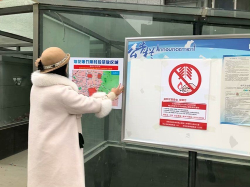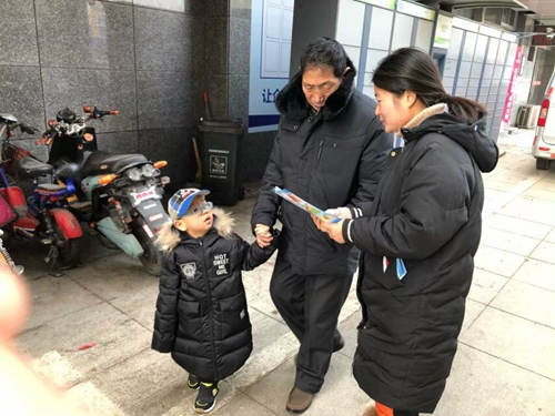 1月18日,知行书院志愿者在济南市文昌社区开展禁止燃放烟花爆竹的宣传活动。