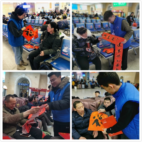 志愿者为候车旅客送“福”