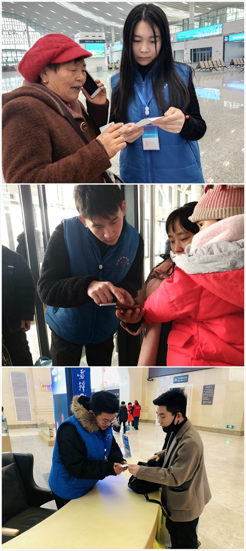 志愿者引导旅客进站