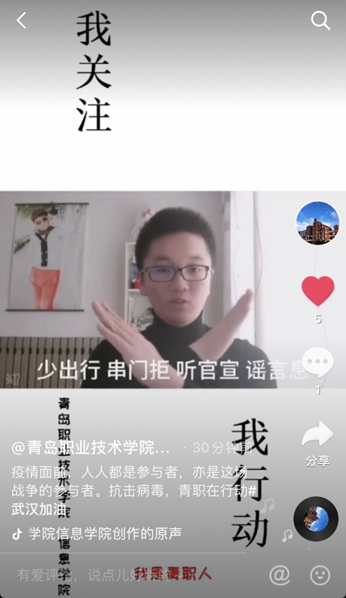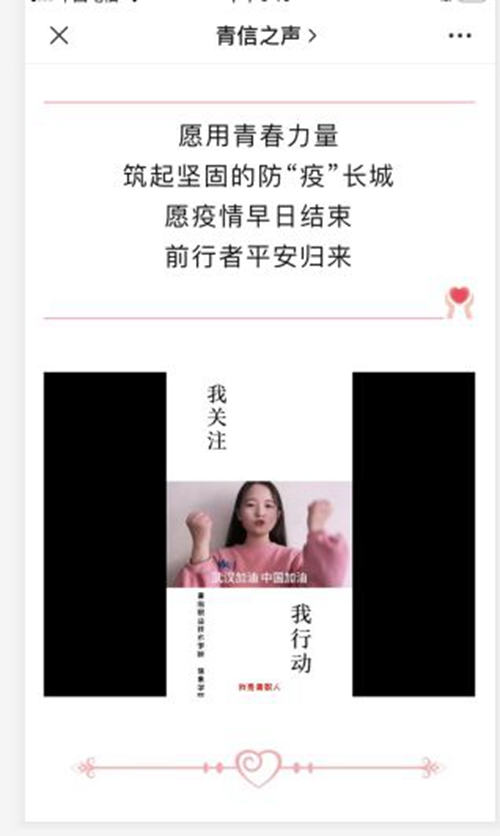 信息学院高度重视疫情防控工作,在严防严控的同时,充分发挥青年学生的优势,学生骨干力量发挥模范带头作用,组建了一支抗“疫”宣传员队伍,每天将国家权威平台发布的信息筛选后,转发给各团支部学习,并制作了《我关注我行动——我是小小宣传员》抖音短视频,以大家喜闻乐见的形式,帮助师生增强防控意识,自觉做好防护与居家隔离工作,从宣传引导、人员信息统计等方面细化防范措施,为打赢抗疫阻击战提供了有力保障。宣传员队伍成员赵家蝶说道:“我们愿意与所有工作在前线的奋斗者并肩作战,担当起青年学生的使命。”
