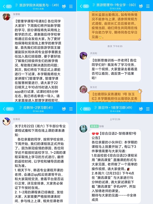 “停课不停教、停课不停学”,旅游学院全体任课老师都已经行动起来。本周末老师们都紧锣密鼓地在各个教学平台和学生们进行试课,并将试课的收获和出现的问题通过微信、QQ群与旅游学院全体老师共享、交流在线教学经验……确保开学第一周的在线教学顺利开展。