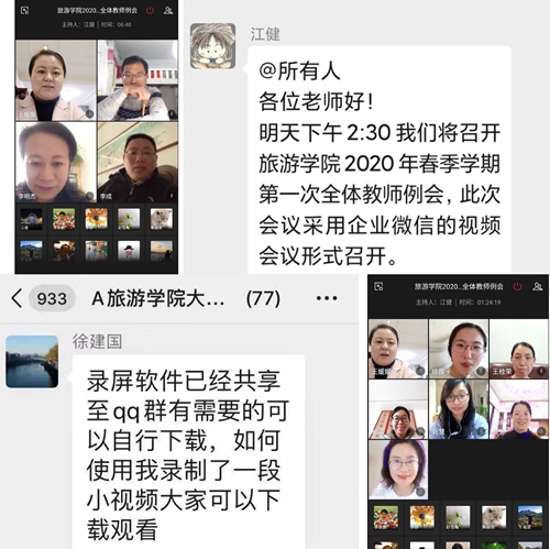 自2月7日起,旅游学院教学院长多次在企业微信组织各教研室主任召开线上教学工作会议,认真梳理春季学期开设的每一门课程,充分讨论线上教学过程中可能遇到的问题及困难,从线上教学平台选择、线上教学技术支持、线上教学课程资源建设、线上教学质量监控、线上学习质量监控等多个方面着手准备,确保线上教学有序开展。
