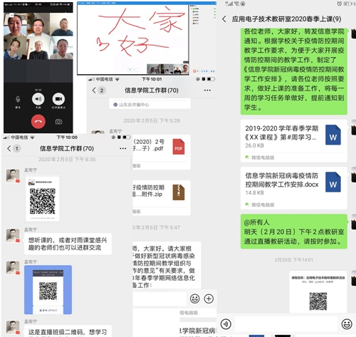 近日,信息学院按照学校相关文件要求,通过建立班级微信群、QQ群等方式搭建师生沟通渠道,积极部署疫情防控期间的线上教学准备工作。按照“停课不停教、停课不停学”的要求,信息学院精心安排疫情防控期间的相关授课工作,号召师生齐心聚力,利用智慧树在线课堂、腾讯课堂、腾讯会议、云班课等多种网络平台开展教学工作,助力网络教学工作的有序展开。