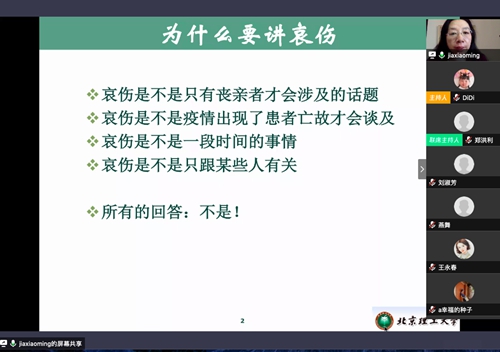 此次讲座邀请了北京理工大学教授贾晓明作“我们与哀伤同行”专题讲座。贾晓明根据多年工作以及研究经验,结合传统节日清明节以及中国文化详细讲解了什么是哀伤、哀伤的特点和表现、哀伤仪式等内容,并在讲座后就有关问题进行了答疑。