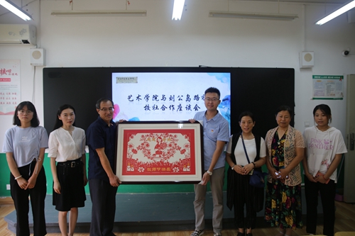 刘公岛路社区向艺术学院贺赠《感恩老师》剪纸作品并合影留念