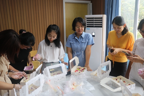活动中,学校师德模范王威、优秀教育工作者柴凤娟分别作教书育人工作经验交流,两位教师的交流使商学院教职工更加明确了爱岗敬业、立德树人的责任和义务,对进一步加强师德师风建设起到了积极的推动作用。交流结束后,全体教职工一同学习制作蛋糕,老师们在蛋糕师傅的指导下兴致盎然地进行蛋糕裱花、摆放水果,有条不紊地进行各种制作程序。在制作过程中,大家相互交流操作方法和技巧,分享活动感受。