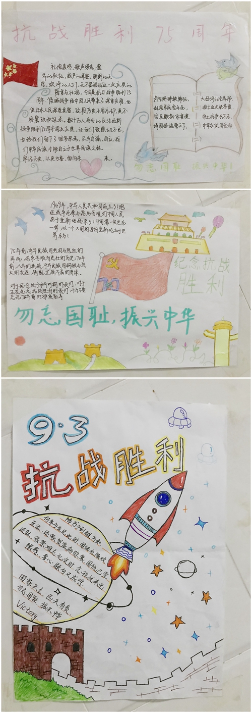 活动中,各班召开了主题班会,了解了中国人民抗日战争历史进程、具有的意义和影响,部分同学利用课下时间观看了《南京南京》等红色影片,楼管会同学绘制了抗战主题手抄报,加深了对抗战的认识,进一步激发了爱国热情。