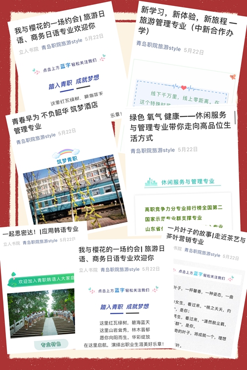重视网络宣传力量,精心谋划,搭建新媒体宣传平台。旅游学院成立由院长、党总支书记带头,各部门主任参与的招生宣传组,根据近几年教学实际,结合行业企业最新发展趋势,从培养目标、核心课程、就业方向、师资力量、办学条件、专业成果等考生最想了解的角度,重新编写了专业简介,发布在旅游学院网站、微信公众号等平台。