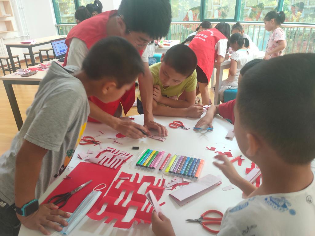 在“字体剪纸”体验课中,志愿者带领孩子们折纸、画样、裁剪,创作了字体多样的剪纸作品。