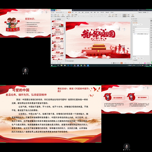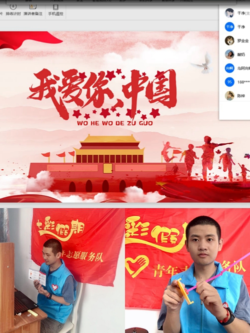 活动中,志愿者围绕“国歌及五星红旗的由来”“缅怀英雄先烈”“践行爱国精神”以及“少年强国说”几个板块展开,利用“七彩假期”学习礼包中的模拟升旗仪式装置,线上模拟升旗,同时为增进学习的知识性、趣味性和情感性,还加入了爱国知识竞答互动环节和爱国散文接力朗诵环节;通过播放抗击疫情、抗击洪水的宣传短片,使孩子们感受全国上下同心协力的奉献精神和爱国情怀,帮助孩子们树立爱国、奋进的信念。
