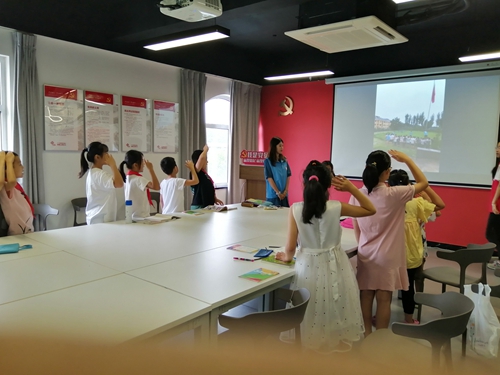 活动中,两支志愿服务队共同开设了“学习国旗法”“升旗仪式”等系列课程,并对峨眉山路社区和沂水县的孩子们进行了爱国主义教育。课堂上,筑梦成长志愿服务队借助立人书院抖音平台,进行了直播宣传,两个志愿服务队的志愿者们通过微信视频在线进行了升旗仪式,并为孩子们亲身示范了升旗敬礼的标准动作。