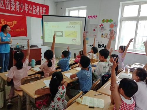 根据共青团中央有关部委联合实施“七彩假期”志愿服务项目的有关要求,知行书院组建了萌萌化学家志愿服务队,第二年赴张家楼镇庄家疃村共青团流动少年宫开展支教活动。志愿者结合团中央“七彩假期”大礼包中的课程指导手册和自身专业特长,设计了兼具思想性、知识性和趣味性的众多课程,包括《我的祖国》《安全自护》《垃圾分类》《化学红绿灯》《神奇的“面包”》《化学流星雨》等内容。
