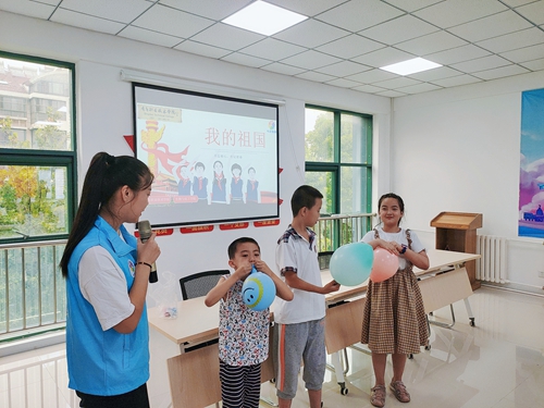 活动中,我校志愿者以“我的祖国”为主题开展授课,与小朋友们一同观看了视频《祖国妈妈,我爱你》,引导小朋友们用心感受新中国成立70年以来波澜壮阔的历史征程。志愿者们还开展了《我和我的祖国》歌曲教唱,通过歌声抒发对祖国母亲的热爱之情。在“快问快答”知识竞答环节,志愿者带领小朋友们了解历史、地理和人文知识,进一步加深对祖国的认识。