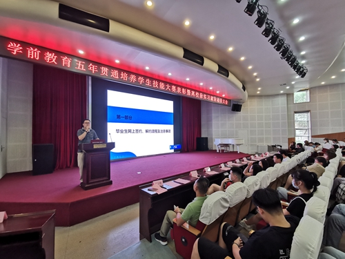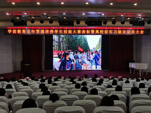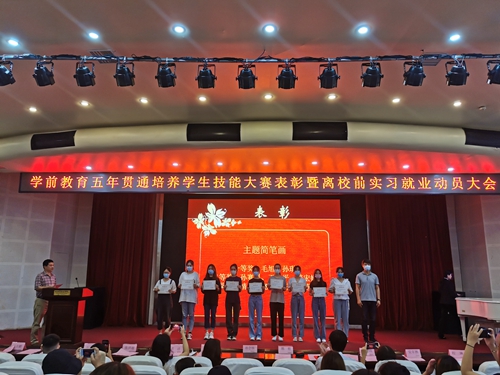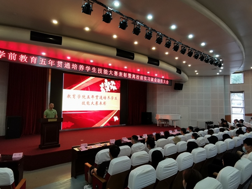 7月8日上午,教育学院在艺术厅举办五年贯通培养学生技能大赛表彰暨离校前实习就业动员大会,教育学院相关负责人、学前教研室主任、五年贯通培养带班班主任及辅助班主任、五年贯通班全体学生参加了大会,会议由教育学院副院长孙会扬主持。