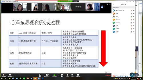 活动中,辅导员们总结、分享了6月的学习成果,从革命的背景、纲领等方面进行了交流学习。教授武文梳理了5、6月份的学习主题及内在逻辑关系,阐述了毛泽东思想和新民主主义革命的关系,详细讲解了新民主主义革命发生、发展、变化的过程。最后,大家就学习中及学生思想政治教育过程中发现的教学难点进行了重点研讨。通过对新民主主义革命历史的研讨学习,辅导员们坚定了对中国共产党、中国特色社会主义发展方向是历史的必然正确选择的认识。