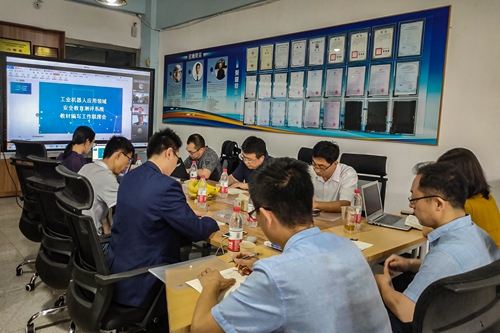 会议就工业机器人应用编程1+X系列丛书中的《工业机器人应用领域安全教育与测评》教材的编写思路和注意事项等展开深入交流,研究讨论了教材对应的大纲内容、教学标准等。