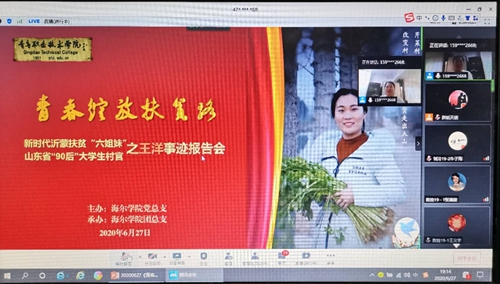6月27日,海尔学院党总支以《青春绽放扶贫路》为主题举办脱贫攻坚先进人物事迹宣讲报告会。新时代沂蒙扶贫“六姐妹”、山东省“90后”大学生村官、共产党员王洋开启“云直播”。海尔学院全体师生、长江路街道峨眉山路社区党委、香江路社区党委等社区学院共建单位600余人共同收看报告会。报告会由海尔学院团总支书记丁志健主持。